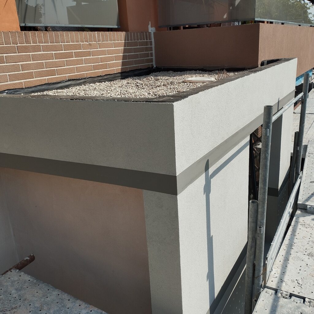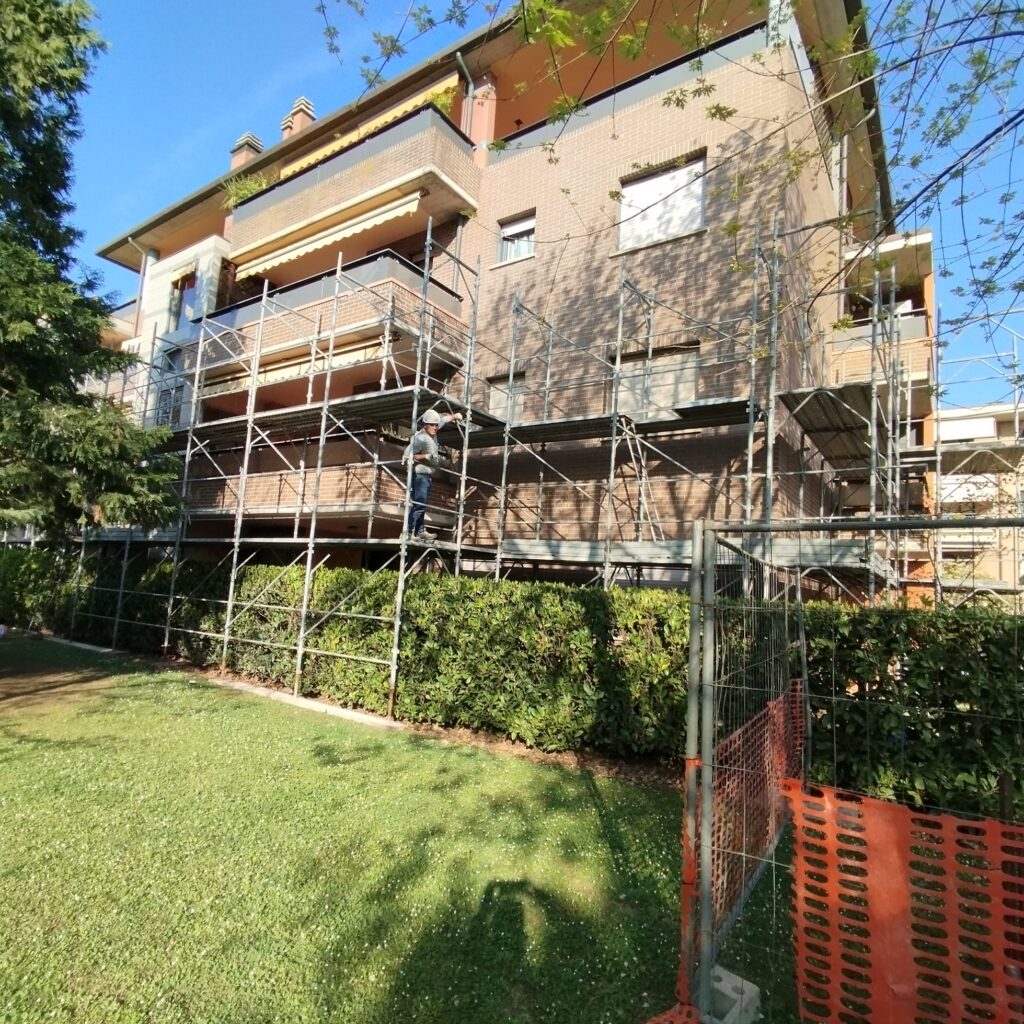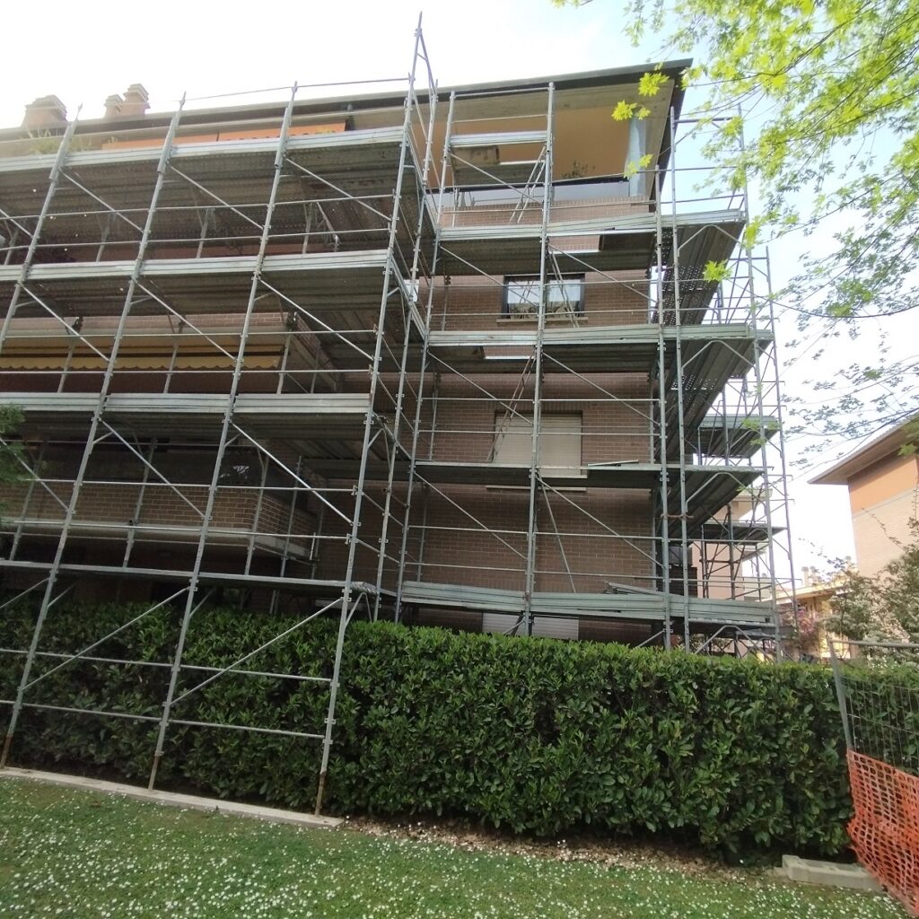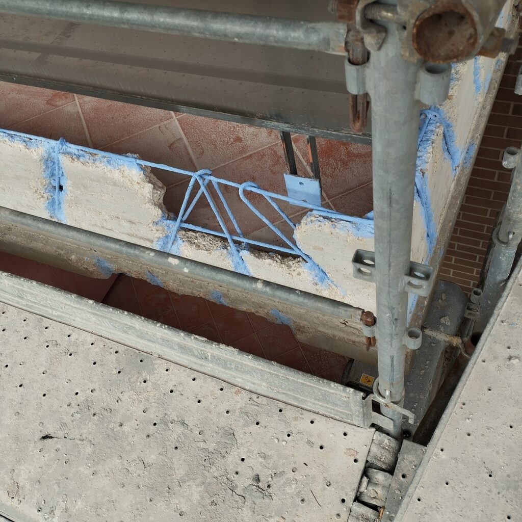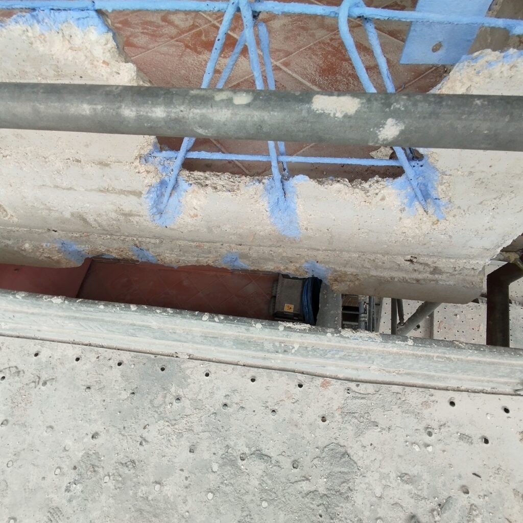 Intervento di manutenzione straordinaria con rimozione su porzioni di fabbricato di rivestimenti, rasatura armata e pittura a disegno, ripristino del calcestruzzo armato ammalorato e consolidamento con malta fibrata