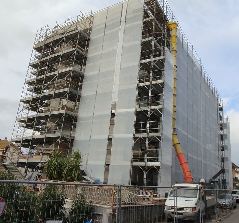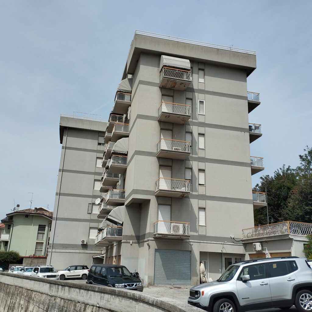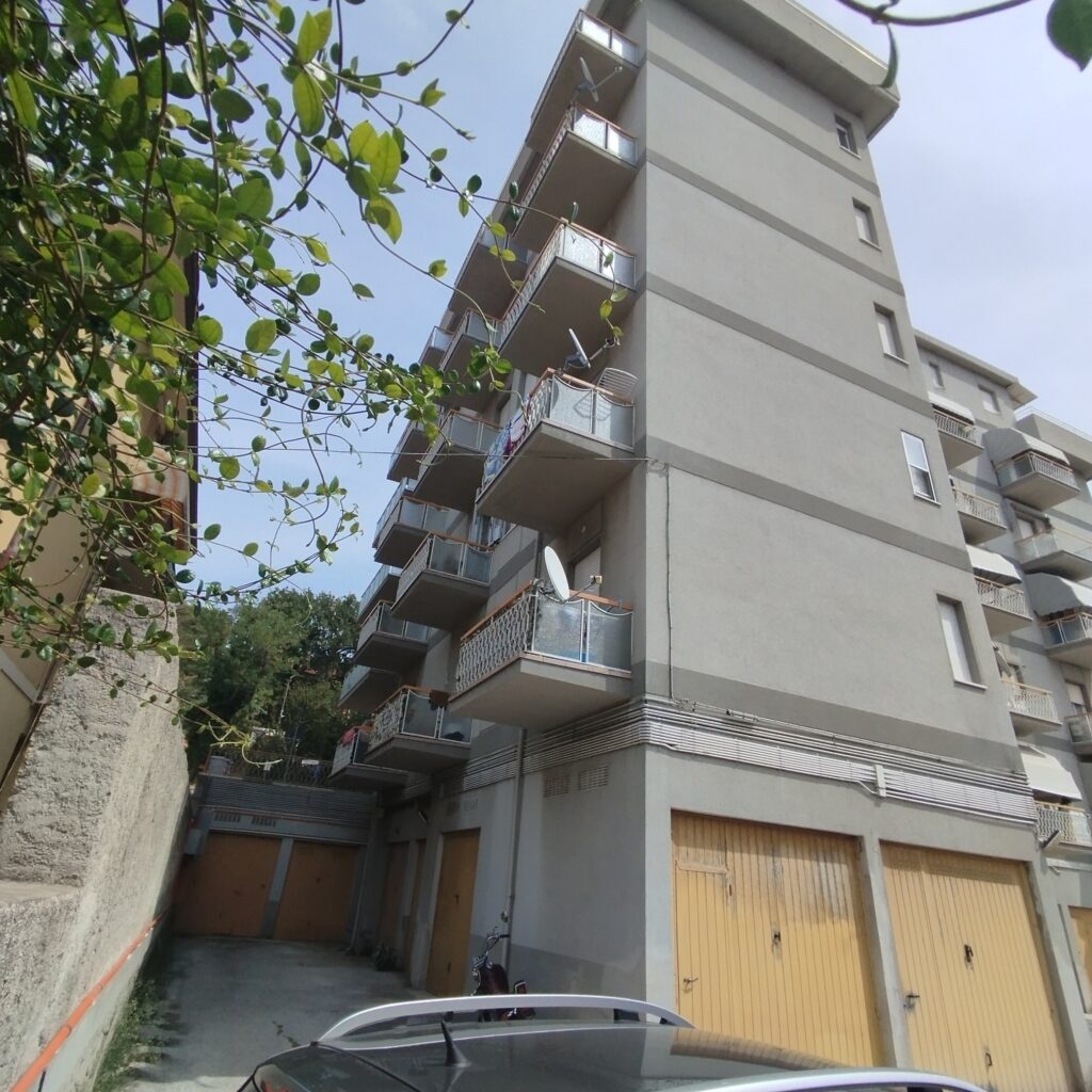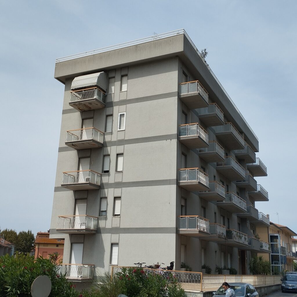 Intervento di manutenzione delle facciate con ripristino delle parti in calcestruzzo ammalorato, rifacimento delle pavimentazioni e delle ringhiere dei terrazzi, e applicazione di un nuovo ciclo di tinteggiatura a spatolato per una finitura uniforme e durevole.