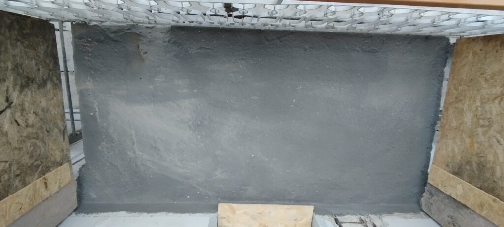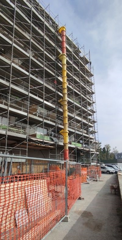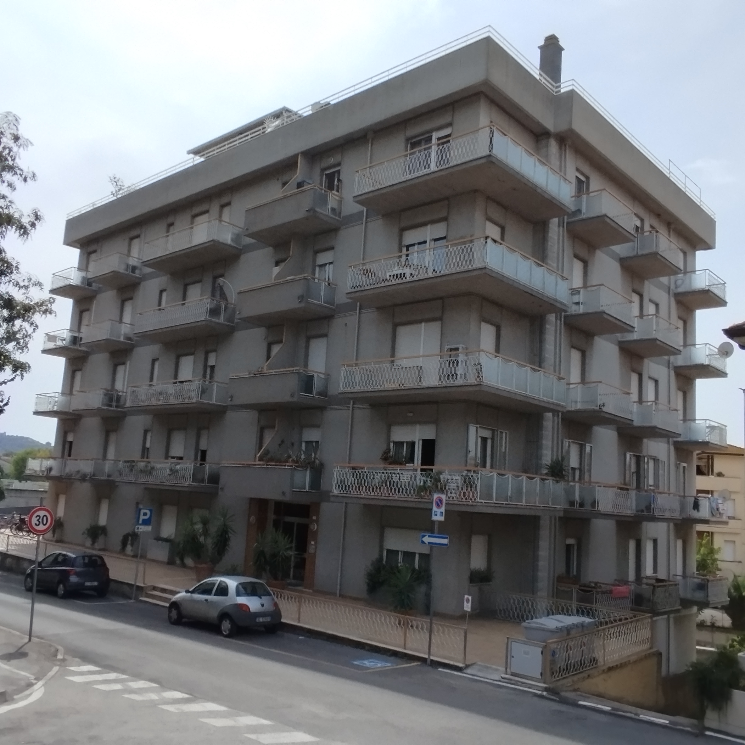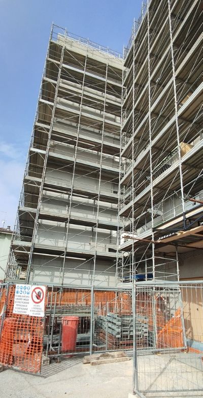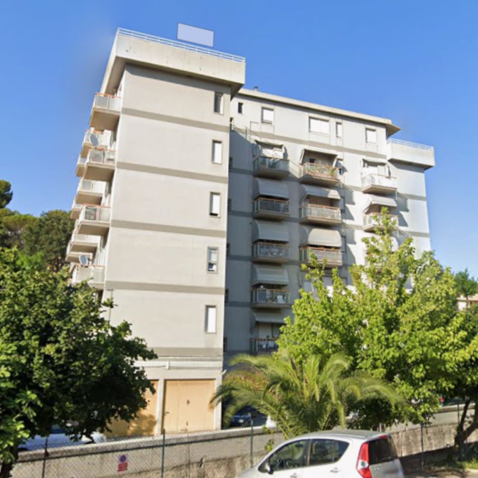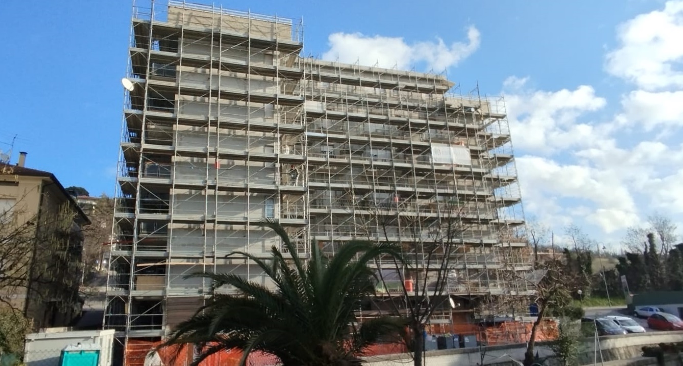 Intervento di manutenzione delle facciate con ripristino delle parti in calcestruzzo ammalorato, rifacimento delle pavimentazioni e delle ringhiere dei terrazzi, e applicazione di un nuovo ciclo di tinteggiatura a spatolato per una finitura uniforme e durevole.